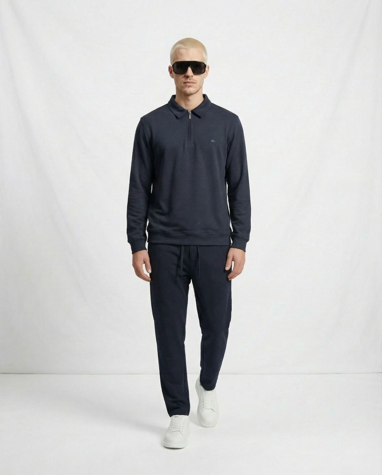 Conjunto de dos piezas de estilo moderno y minimalista. Incluye sudadera de manga larga con cuello tipo polo y media cremallera, y pantalón jogger con cintura elástica y cordón ajustable para un ajuste cómodo. Su diseño limpio y el tono beige lo convierten en una opción versátil para looks casuales o urbanos.