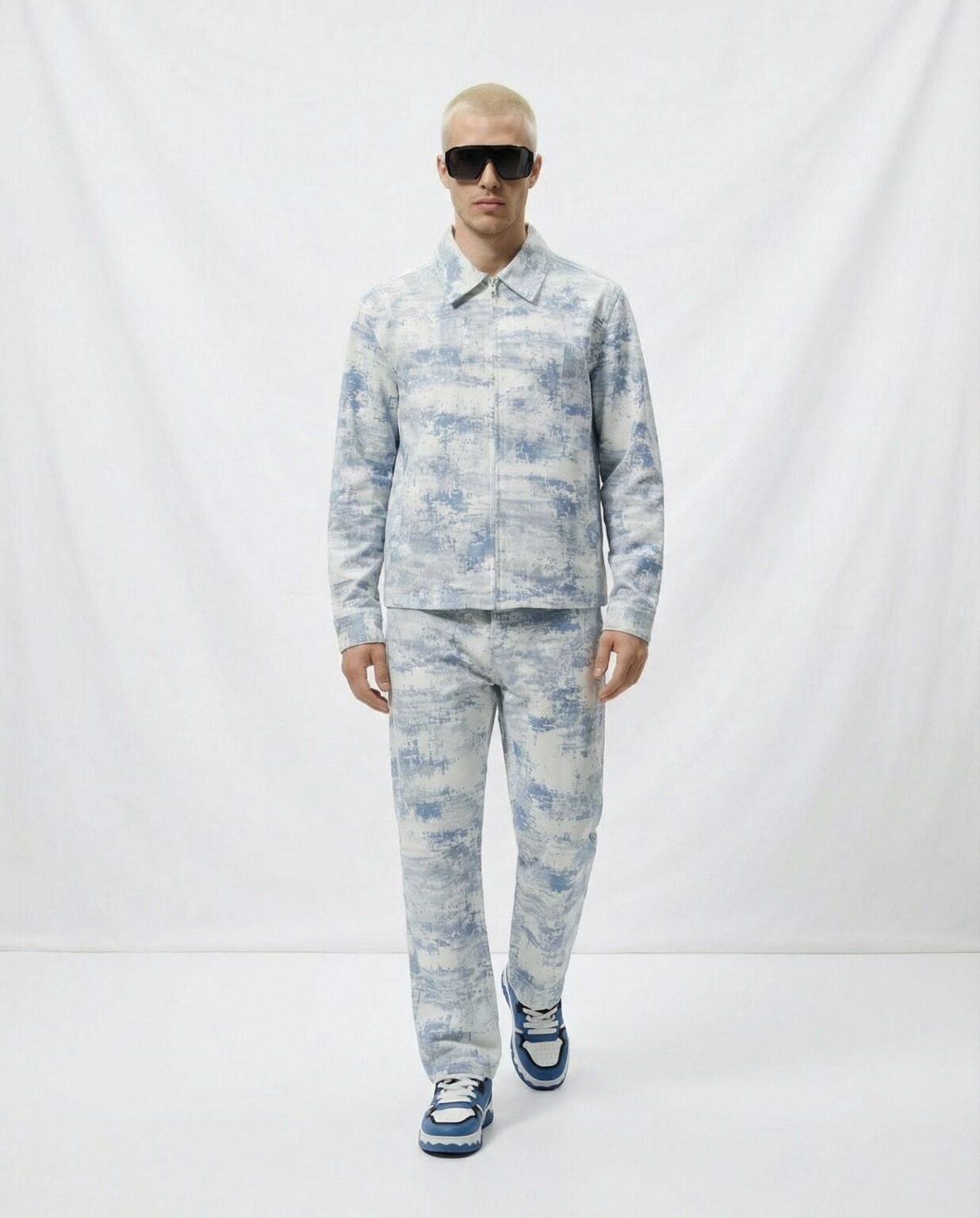Es un conjunto de dos piezas compuesto por chaqueta y pantalón largo, confeccionado en una tela clara con con un estampado abstracto en tonos azul claro y blanco